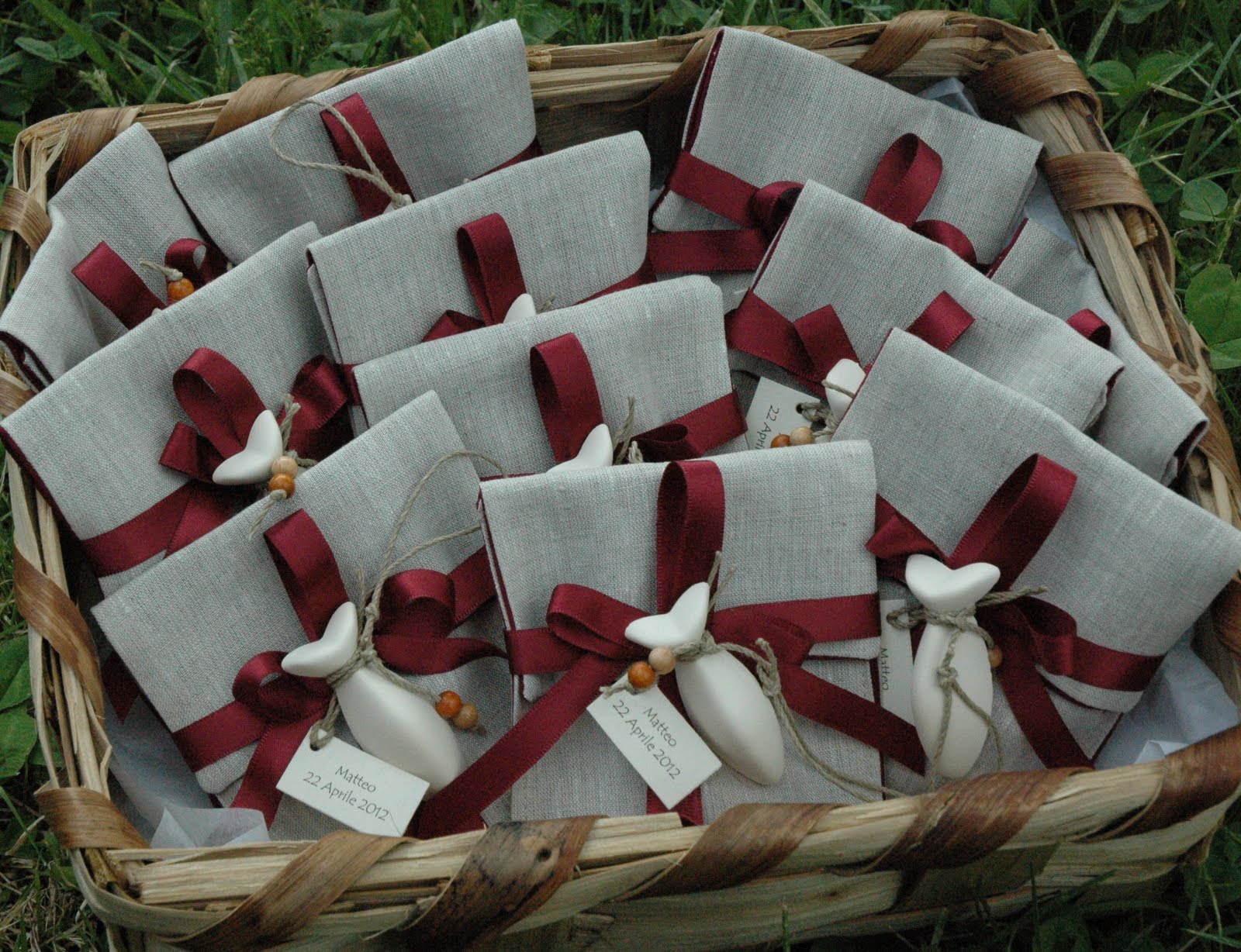 Ma ora passiamo alle bomboniere.... lino grezzo e bordeaux, nastri in tinta, ma per rendere più spiritoso il tutto ho inserito un pesciolino di gesso profumato ....