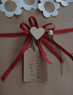 Non ho mai amato le carte eccessivamente decorate, almeno che non si tratti di bimbi, e di solito utilizzo carte neutre così da poter giocare con altri decori. Questa volta ho scelto i toni del rosso .... carta semplice da pacco e un pò di bianco. Una tag per specificare l'occasione. Tutto qua!