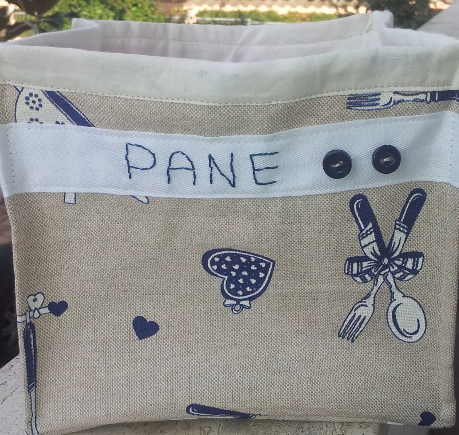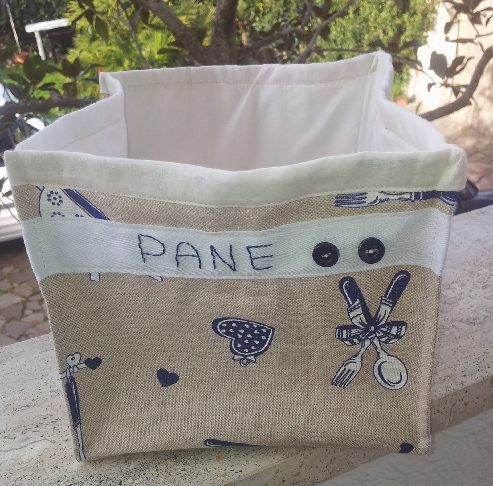 Qualche giorno fa chi mi segue anche su facebook ha già visto le foto di quello che vi presento oggi. Una cliente mi ha commissionato un portapane in tessuto. Una stoffa con dei disegni molto teneri in blu e bianco .... una striscia bianca di fettuccia ricamata con la scritta "pane" .... qualche bottoncino blu .... e il gioco è fatto.