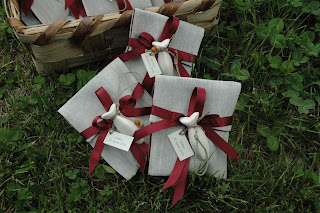 Ma ora passiamo alle bomboniere.... lino grezzo e bordeaux, nastri in tinta, ma per rendere più spiritoso il tutto ho inserito un pesciolino di gesso profumato ....