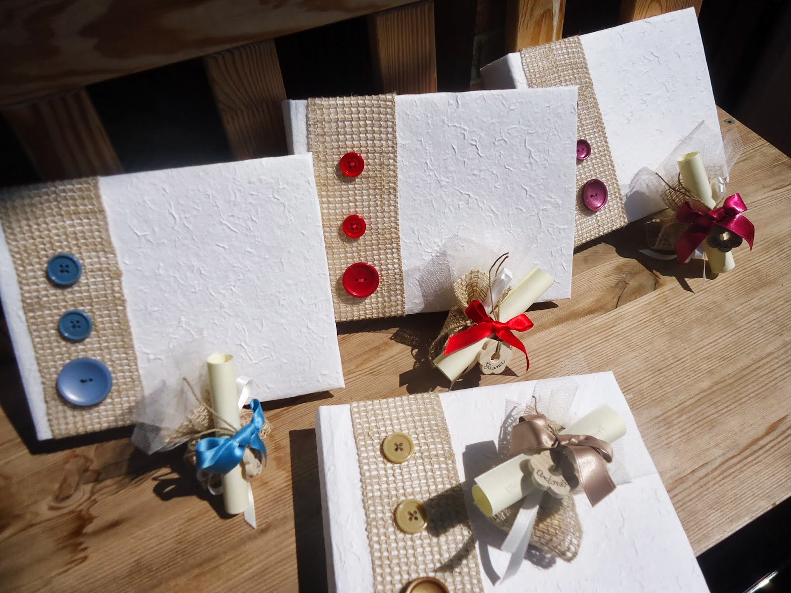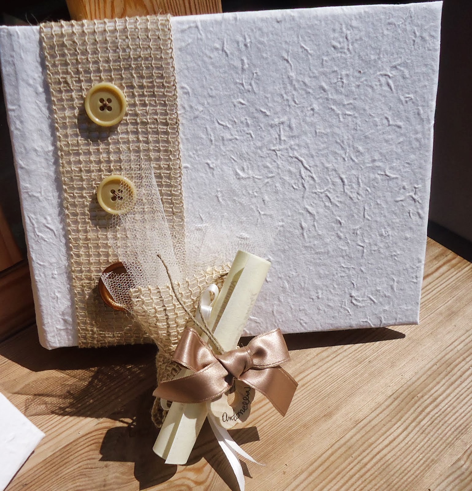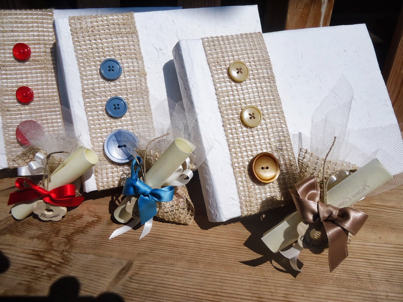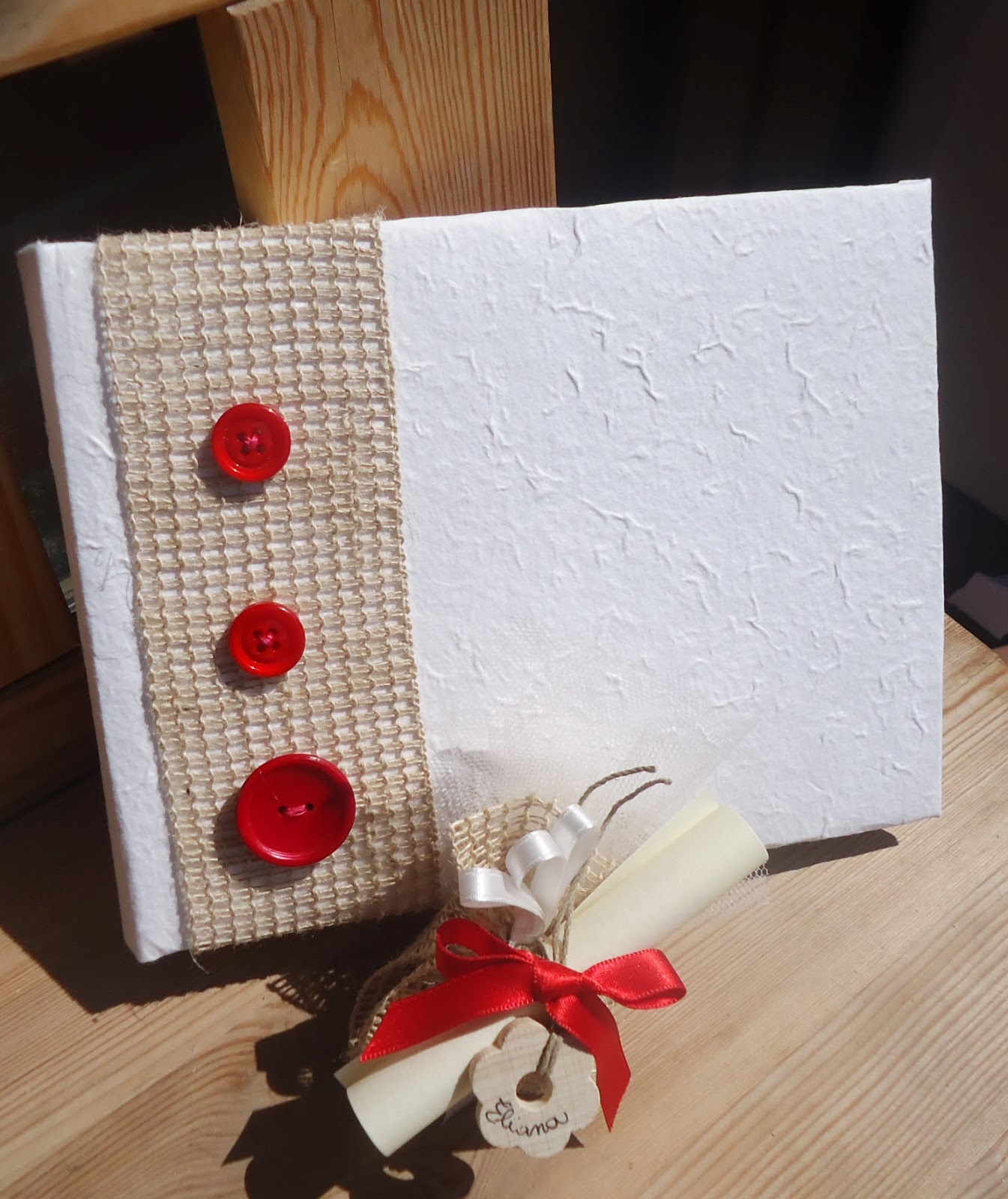 Questa volta cambiamo argomento e oggi parliamo di album fotografici. Quelli che vedete di seguito sono stati realizzati in carta di riso con un decoro in juta e bottoni colorati abbinati con il sacchetto (per i confetti) con gli stessi colori dell'album. Un piccolo fiore grezzo di legno per dedicarlo alla persona che lo ha ricevuto.