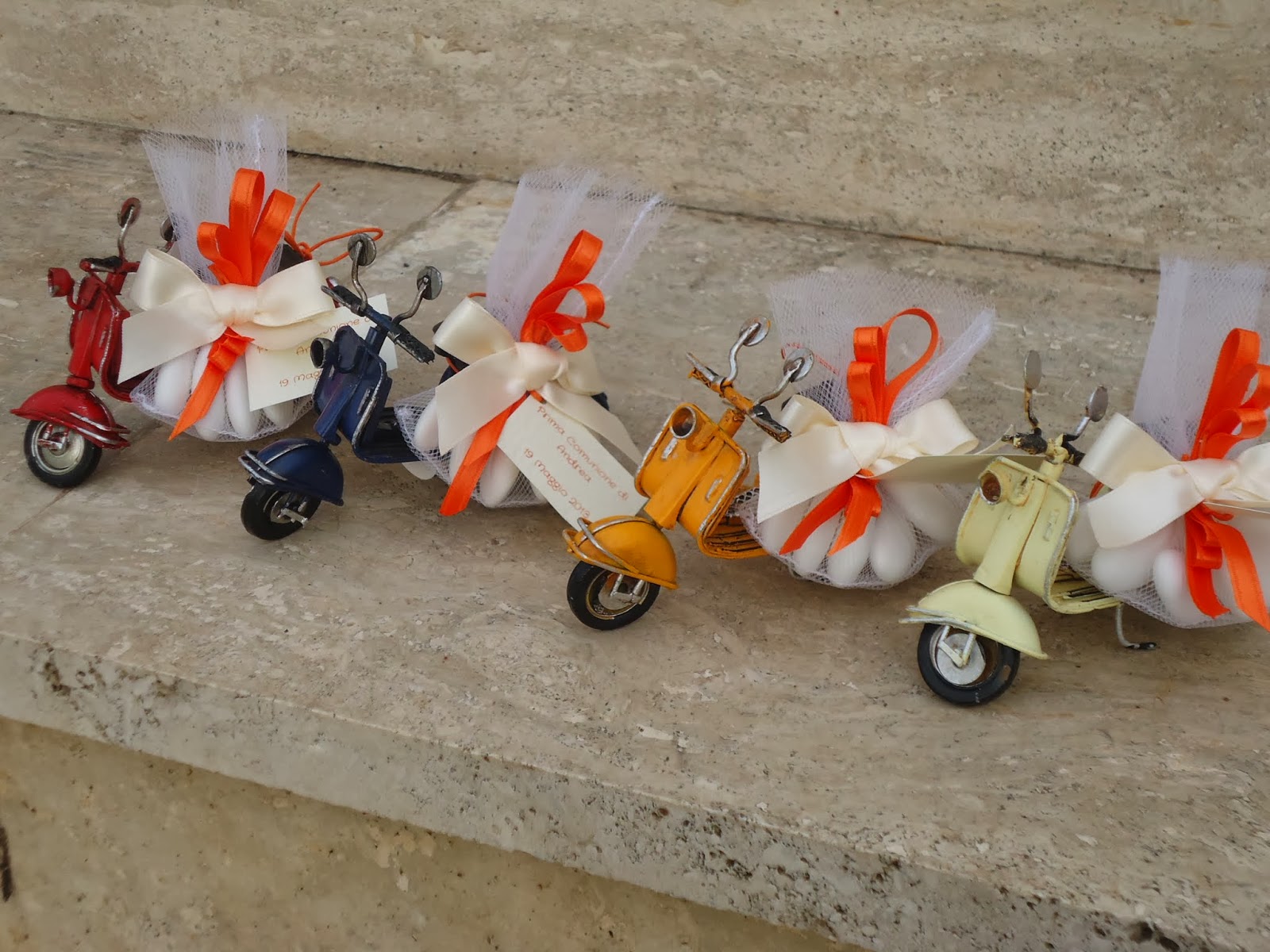 Come spesso suggerisco ai miei clienti .... a volte se si sceglie un'oggetto come parte predominante della bomboniera, è sempre meglio dare "importanza" all'oggetto stesso... (scusate il giro di parole).... Spiego meglio... le bomboniere realizzate a mano hanno sempre il loro fascino. Ma ci sono delle situazioni dove è l'oggetto stesso che la fa da padrone. In questo caso Andrea ha scelto delle vespette un po' stile "retrò" ... quindi niente più dei confetti per confezionarla. Ma invece del solito tulle quello per intenderci rotondo classico delle bomboniere... ho realizzato un piccolo sacchetto sempre di tulle, ma rettangolare ... e poi con un gioco di nastri e cordoncini l'ho legato alla vespetta.